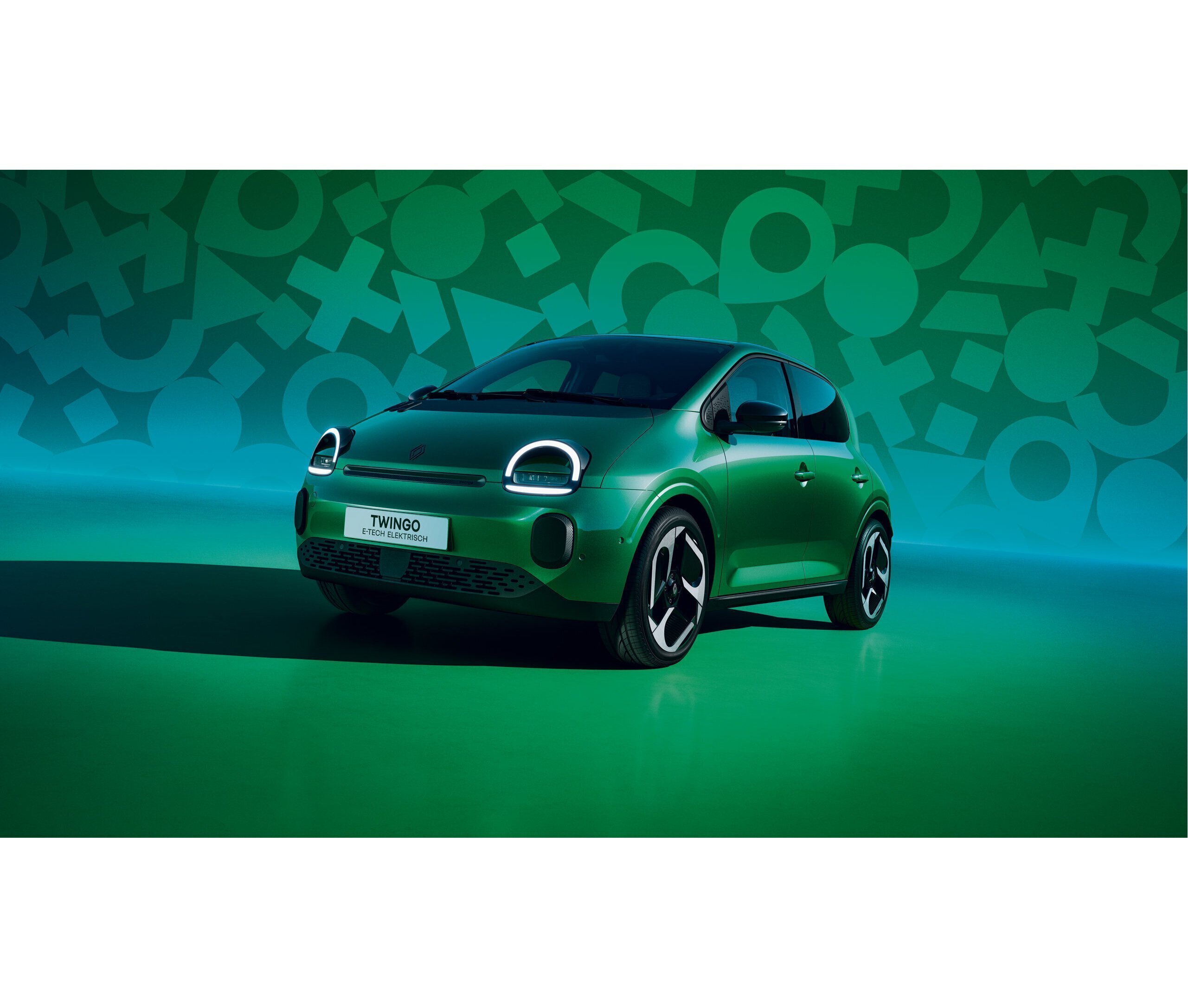 Fünf Renault Elektroautos vor einem blauen Hintergrund mit dem Slogan: